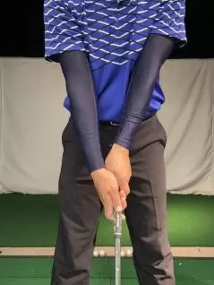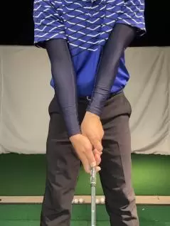 グリップしてクラブを垂直に立て、目一杯の力でクラブをギューっと握ります。このときの強さを10、力を抜いてクラブが下に落ちる強さを0としたら、4~5の強さで握るのが基本です。