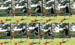 腕の動きも理想的です。アドレスでは適度にリラックスしていて、ガチガチに固めているわけではありません。ただし、アドレスから右ワキだけはしっかり締まっていて、それをインパクトまでキープしています。右ワキが空いてしまうとカット軌道になったり、手打ちの原因になってしまいますが、山下選手のように右ワキを締めて右腕を体につけた姿勢でボールを打つことができれば効率的で安定したスイング軌道になります。