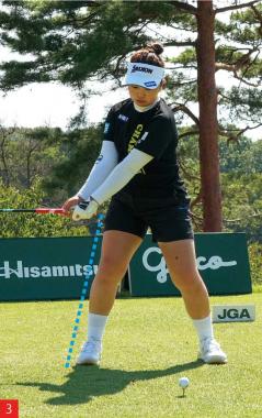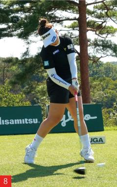 女子ツアーで頭ひとつ抜けた強さをみせる山下美夢有選手は、前傾角度をキープして打つのがすごく上手い選手。腰への負担が大きい深めの前傾ではなく、アドレスでの前傾は浅めです(写真1)。浅めの前傾角度をバックスイングからトップ、そしてインパクトまで完璧にキープできています(写真5)。