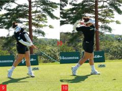 これだけ精度が高いドライバーショットが打てる理由は、ヒジから先をほとんど使っていないからです。手首を使うとインパクトでフェースが開いたり、閉じたりするミスが出てしまいますが、山下選手は手首をほとんど使っていません。インパクトでの手元の角度がアドレスとほとんど同じです(写真8)。さらにフォローでも両腕の真ん中に手首とシャフトがきています(写真9)。よくゴルフレッスンでは「両腕の三角形を崩さないことが大切」だと言われていますが、山下選手は両腕の三角形キープが完璧にできていると言えるでしょう。