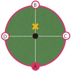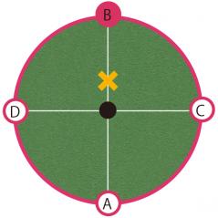 「同一平面上のグリーン、距離にしてそうですね2メートルを考えましょうか?A、B、C、Dの4方向から打つ場合、どこに仮想カップ(仮想ポイント)を決めて打ちますか?」