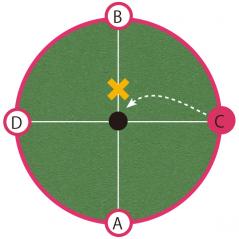 勘のいい方ならもうお分かりだろう。同一平面上と考えた場合、4方向から狙う場合、ポイントは1点。ラインは関係なく、どこから打っても同じところを狙っているのだ。