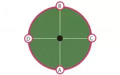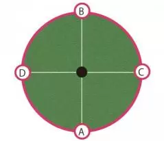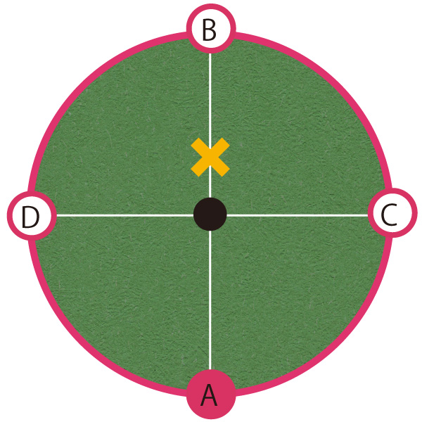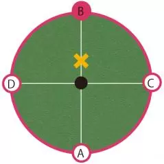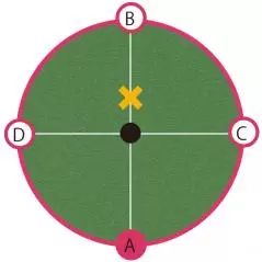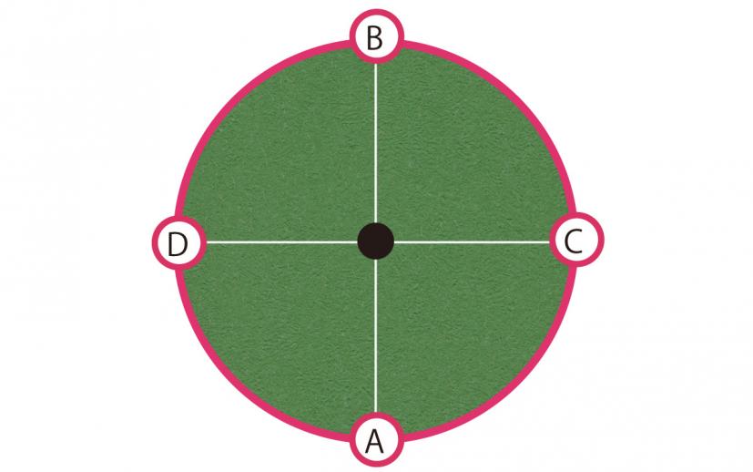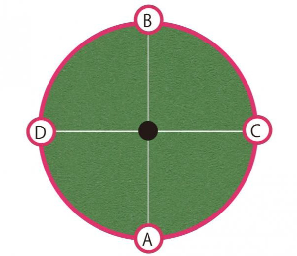 「同一平面上のグリーン、距離にしてそうですね2メートルを考えましょうか?A、B、C、Dの4方向から打つ場合、どこに仮想カップ(仮想ポイント)を決めて打ちますか?」