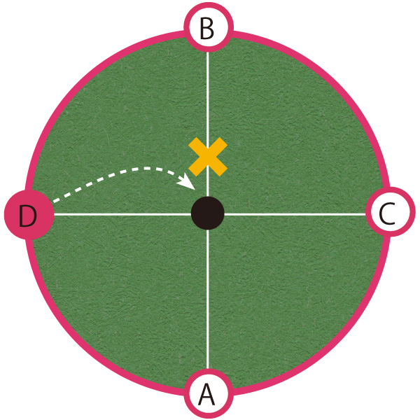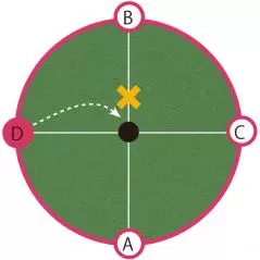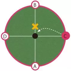 勘のいい方ならもうお分かりだろう。同一平面上と考えた場合、4方向から狙う場合、ポイントは1点。ラインは関係なく、どこから打っても同じところを狙っているのだ。