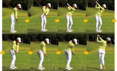腰の回転が止まり、クラブを上に上げていく。左ヒザは前に出るが、横には流れない。左足カカトで地面を踏み、浮かせないのが稲見流。