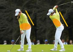バックスイングの途中から腰の回転、下半身の動きはほぼ止まり、上体の回転だけでトップの位置までクラブを上げていく。