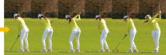 インパクト後、右腕は完全に伸びていく。ヘッドを目標に向かって出すことにより、インパクトゾーンが長くなる。フィニッシュではヘソが完全に目標を向くまで回していき、左足に完全に体重が乗る。右足はツマ先だけが地面に着いているのが正解。