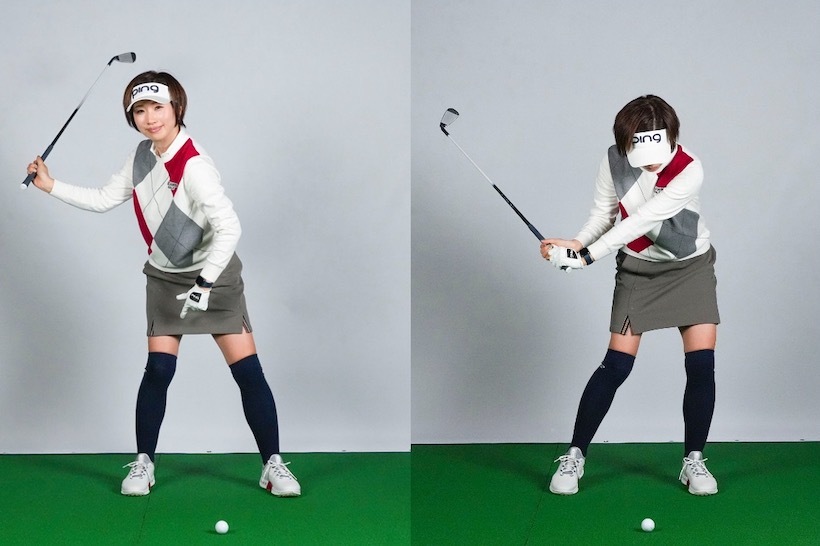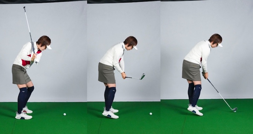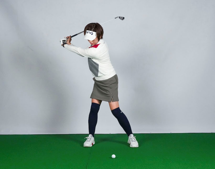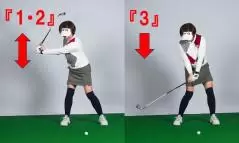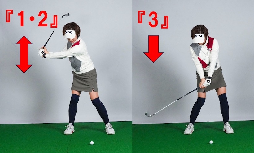 トップまで行ったら手は一切使わず「1、2、3」のリズムでクラブが上下するようにタイミングをとる(バンプ)感じで動きます。