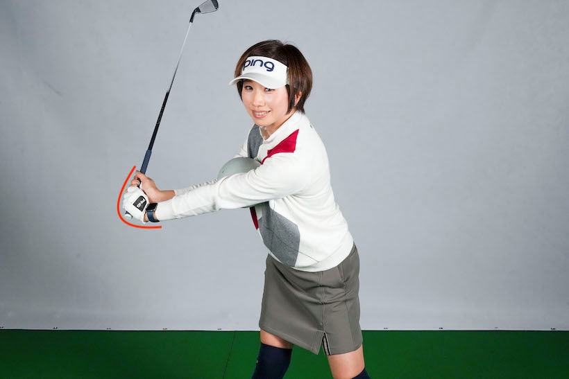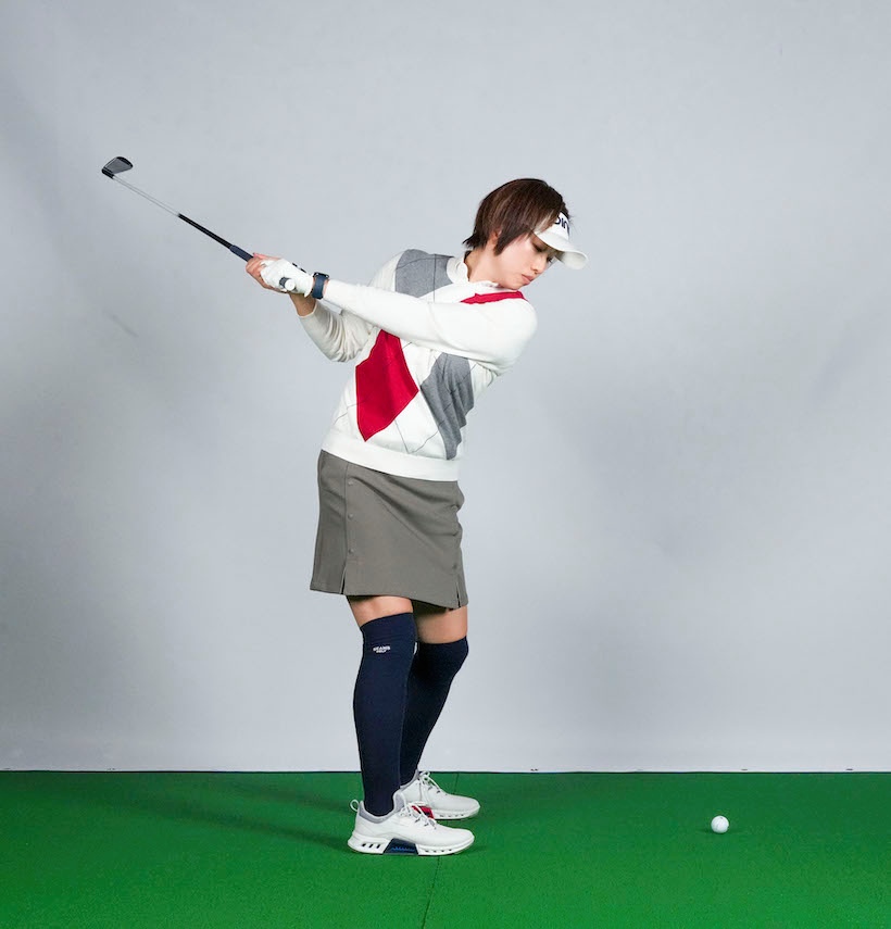 スイングの始動で右を向き、体も回るようになるとバックスイングのプロセスでクラブがどう動いているかチェックできるようになります。もちろん普通にスイングする時はこの限りではありませんが、Kさんには、打つ前に一度チェックしてからスイングするようにおすすめしました。