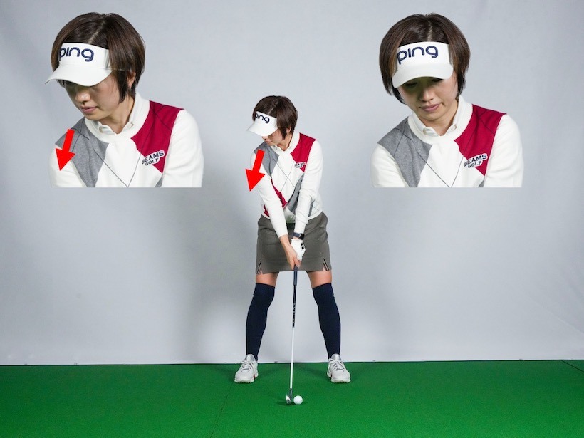 というのも、頭を残しすぎる原因は、おもにボールを見すぎているから。そこでボールを凝視せず、左目の端でボールを見るような感じにしていただいたのです。