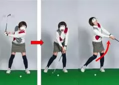 ●修正方法:テークバックで顔を右送りながら胸を回す、ボール挟みドリル