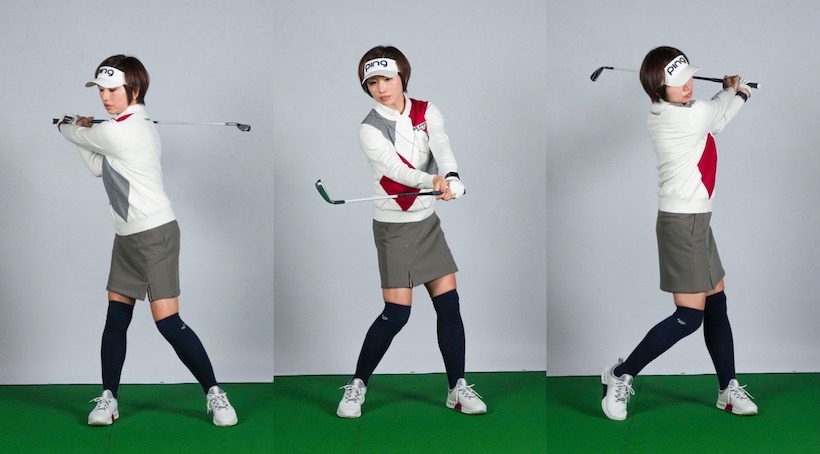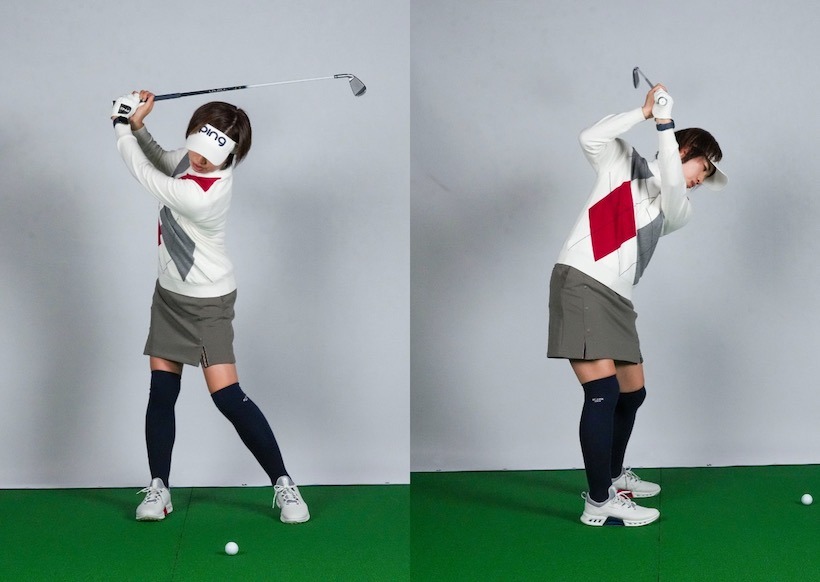 壁タッチとともに「ヨコ素振り」も取り入れました。壁タッチにも後傾を防ぐ効果がありますが、手を使わずにトップを大きくしようとしてクラブを高い位置に運ぶと後傾せざるを得ません。