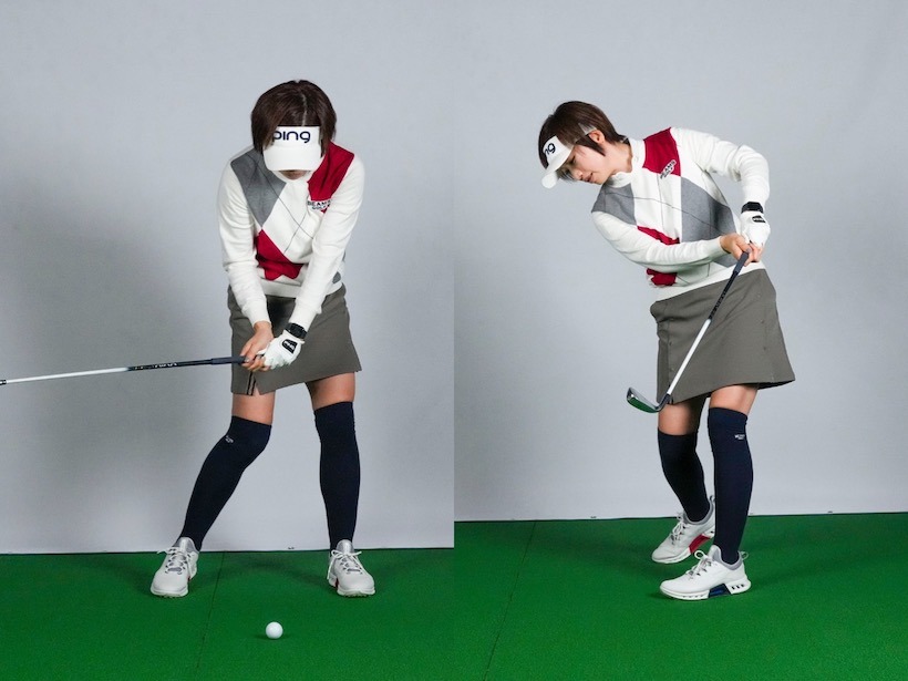 スイングの傾向はリバーススパインアングル。スパインアングルのスパインは背骨という意味、アングルは角度なので、スパインアングルとは背骨の角度=アドレス時の前傾角度を指します。スイング中もこの角度を変えずに体を回すことが重要なのは、みなさんご承知のとおりです。