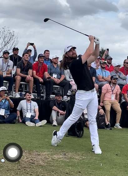 そして黒山の人だかりしているブースを発見! コブラですね! ギャラリーの目線の先には、いらっしゃいましたカイル・バークシャー選手です。もうさすがですね、余裕で300ヤードを軽々と超えられていました。コブラはメーカーとしても日本より人気が高いですね。