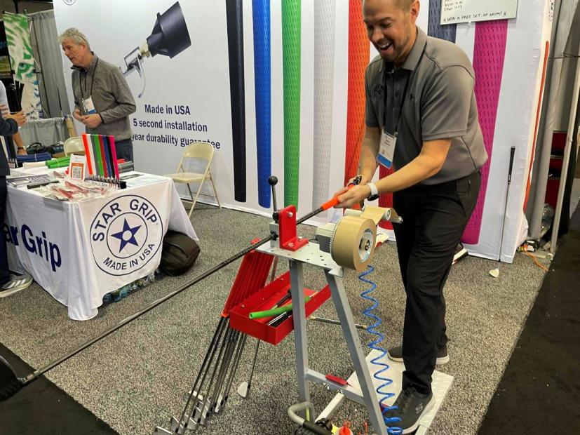 例えばグリップ。「スターグリップ」のこのグリップは両面テープがいらないんですって……。テープなしとは、ボールを打ってグリップがシャフトから抜けないのかしら……、なんて心配しましたが「絶対抜けない!」って、ドヤ顔でメーカーの方は言っていました。専用の取り付けツールを使い、グリップエンドから空気を圧縮しグリップ内に送り込みながらグリップを装着。あっという間にグリップの取り付けが完了です!