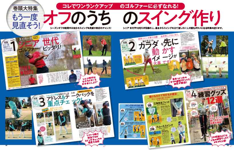 巻頭特集のテーマは「このオフに見直そう あなたに合ったスイング作り!」その中でも目玉はPART1のタイガーの「進化スイング」はシニア世代ゴルファーにピッタリという久々にタイガー・ウッズをフューチャーした企画。シニア世代に馴染みのあるタイガーは、大きなケガや手術を重ねたことによって、カラダの稼動域が狭くなったり、柔軟性が損なわれてきたなかでも新しいスイングで復活してきた。その最新のスイングがとても参考になるという注目の特集です。他にも岩井ツインズを育てた永井哲二プロのレッスンや、飯島茜プロにより鏡を使ったスイングチェックなど、読み応えのある誌面展開になっています。