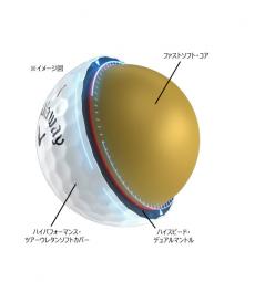高いボールスピードの実現につながっているのが、新たに採用されたハイパー・ファストソフト・コアだ。「CHROME TOURボール」に求められるパフォーマンスに合わせて素材の配合を見直しつつ、生産管理もこれまで以上に徹底したものとなっており、より適切な化学反応を引き起こすことで、前作のCHROME SOFT X LSボール以上に、ロングショットでスピンを減らし、反発力も生み出すコアに仕上がっている。また、その周りに重ねられた2重のマントルも素材の配合を刷新。よりコアの性能を引き出すものにリニューアルされている。