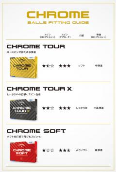 前作で製作工程になされた大きな投資は、今回、ウレタンカバーの成形プロセスにも及び、より均一な厚みを実現。もちろん、グリーン周りでのスピン性能も、従来よりもレベルアップしている。ラインアップは、CHROME SOFT X LSボールの後継で、ロースピンにより中弾道をもたらす「CHROME TOURボール」、CHROME SOFT X ボールの後継で、しっかりめの打感から中高弾道を描き出す「CHROME TOUR X ボール」、そして、もっともソフトなフィーリングと高弾道が爽快な「CHROME SOFTボール」という3モデルだ。