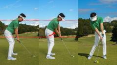 なお、ペタッとソールした状態で手元を下げてトゥ側を浮かせると、前傾が深くなって手が体に近づきます。そのまま振るとインパクトで手元が詰まるので、少しボールから離れて、両腕が真下に垂れた状態にしてください。トゥ側を上げるとボール位置がトゥ側に寄ったように見えますがそれでOK。ヒール側にボールがあるのは論外です。トゥ側を浮かせてアドレスしたら、あとは普通に振ればいいですよ。