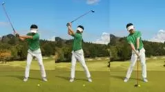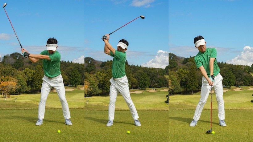 冒頭で肩の話をしたのはこのため。伸び上がりによるトップやチョロは肩、とりわけ左肩の動き方に問題があるからです。具体的にはバックスイングで、左肩が顔を押し上げてしまうことにより上体が伸びているのです。