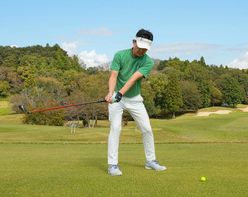 イメージとしては左肩を下げながら右足側に移動させていく。ここで頭が下がってしまうと上体が突っ込むので、左肩を顔から遠ざけるようにします。左肩が顔に近づいたらダメ。そうなったら途中でスイングを止めて仕切り直ししてもいいです。