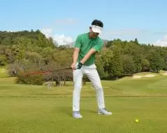さて、今回のテーマはトップやチョロですが、多くの場合、バックスイング時に体が伸び上がり、そのままダウンスイングからインパクトに向かうことで起こっています。例えばドライバーが上手くアッパーブローに打てたあと、2打目のフェアウェイウッドでトップやチョロが出る。それに気づいて打ちに行くと今度はダフり、結局クリーンにヒットできるまで何ホールもかかってしまいます。
