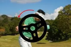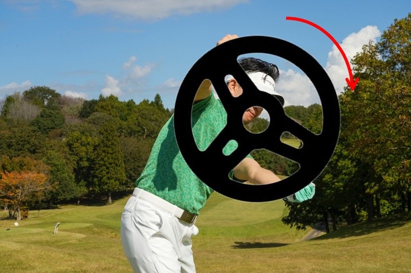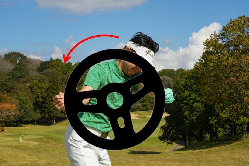 そこから切り返すタイミングで、左にハンドルをきるとアウトサイドから、右にハンドルをきるとインサイドからクラブが下ります。前者はアウトサイド・イン、後者はインサイド・アウトのスイング軌道につながります。つまり、スライスする人は切り返しで左ハンドルをきっているわけです。