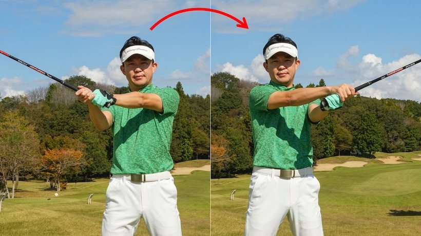 そこでどうするかというと、手首をひねります。というのも「フェース面を返す」と言うと、無意識に腕で返す人が多いから。手首をひねるのと腕で返すのと、どこが違うかというと、腕でフェースを180度返すとなると相当動かさなければならず、スイングが破綻の危機に晒されます。