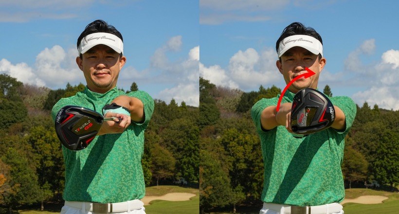 正確に言うとひねるのは手首ではなく、両腕のヒジから先の前腕部分ですが、わかりやすくするために「手首をひねる」という言い方をしています。正しくできれば両ワキがしまったままフェースターンできます。腕から動くとワキが空くのですぐにわかるし、輪っかにも当たってしまう。ハンドルと手首のひねり、2つのことをセットでやる必要がありますが、これは万年スライサーを脱する上で重要なステップ。アベレージゴルファーが壁をぶち壊す大きなポイントです。