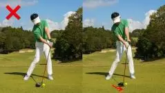 なぜ、そうなるかというと、フェース面を閉じたいから。スライスを嫌がれば嫌がるほど、ハンドルを左にきる格好でアウトサイドから下ろし、ボールをつかまえようとするのです。その方がつかまる感覚になるのですが、実際にはそうでない。この局面ではハンドルを右にきるのが正解です。
