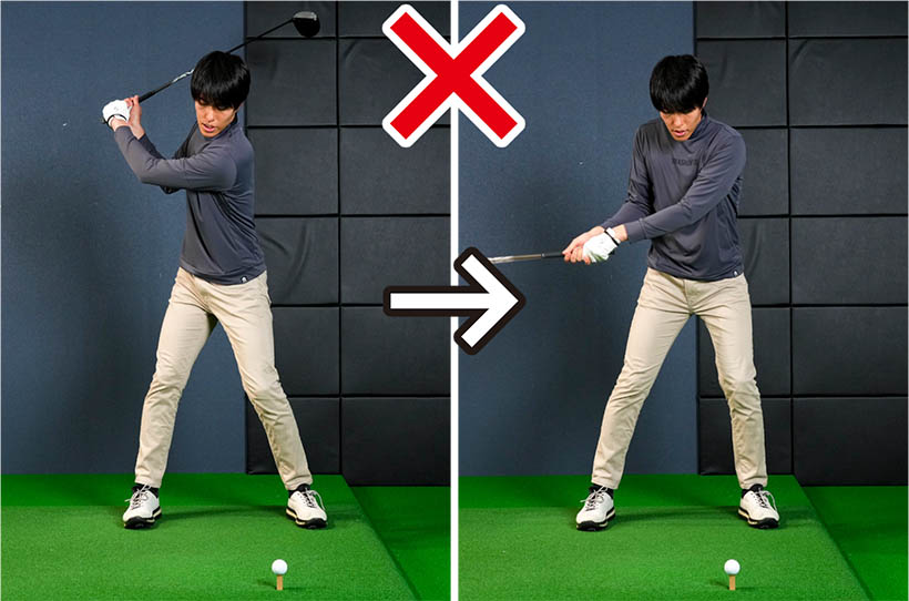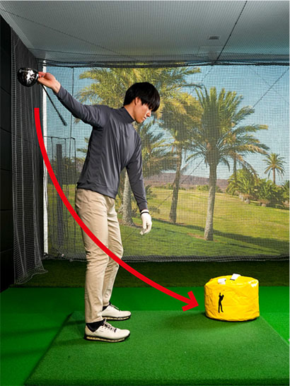 右手で叩く練習をしていると、「叩けるポジション」も自分で把握できます。クラブを振り上げてインパクトバッグを強く叩こうと思えば、右手が叩きやすい位置に自然に収まるはずです。