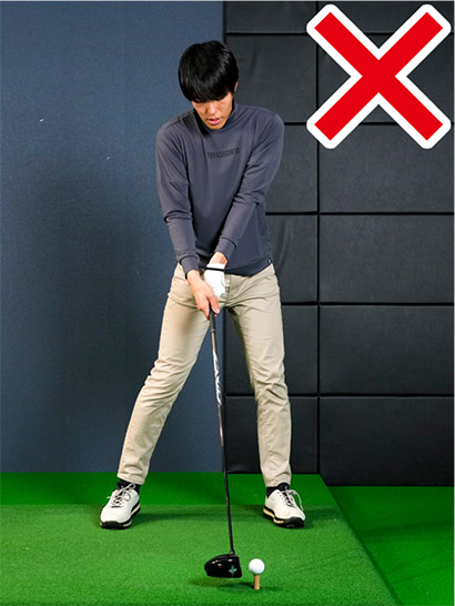 インパクトバッグや布団を叩くときは「どうせ当たるでしょ」と気楽に叩けますが、ゴルフボールを目の前にすると途端にそれができなくなってしまう。クラブを両手で持ってスイングしようとした瞬間に当たりそうもない気がして、極端に言えばコロんでしまいそうで怖くなるわけです。