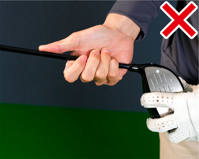 そして右手でクラブヘッド側のシャフトの部分を握り、インパクトバッグを叩くのです。右手は手のヒラで握らないで、細い棒を持つようにクラブを指先で引っかけるように持つのがポイント。これは次回で説明するグリップの基本にも通じます。