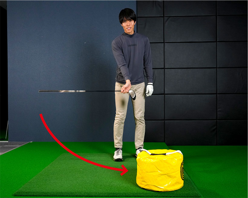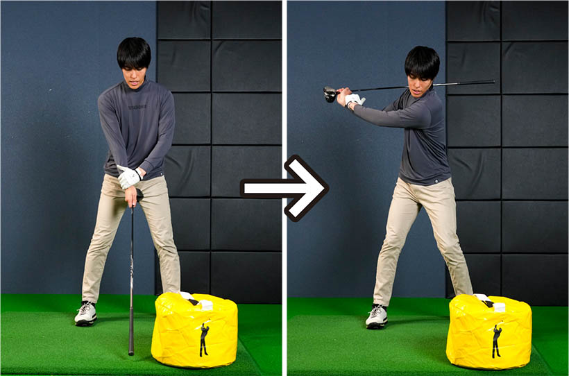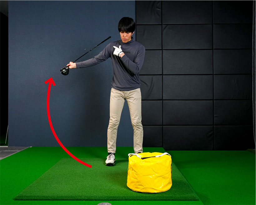 最初は右手首を柔らかく使ってインパクトバッグを叩き、次第に右肩を支点にしてクラブを大きく振り上げてインパクトバッグを強く叩きましょう。