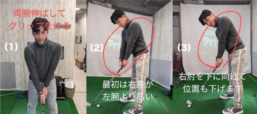 この時に意識するのは、ヒジから先の三角形です。ヒジから先を作る時にも、右腕が高い位置にこないように、右ヒジを下に向けるのはショットの時と一緒。