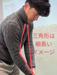 何を間違えていたかというと、「両肩の付け根からグリップを結んでできた三角形」でイメージしてしまったこと。これをやると、まず右腕が伸びたアドレスを作ってしまう。これが諸悪の根源!