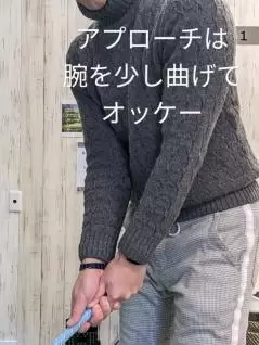 ですが、左腕を伸ばしての三角形を意識しすぎると、アプローチでは少し邪魔になることもあります。特にショートアプローチ。ショートアプローチで大事になるのは、クラブを振り下ろしてスイングスピードを出す動きではなく、スイングスピードを上げすぎないこと。