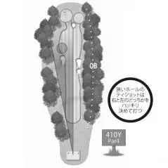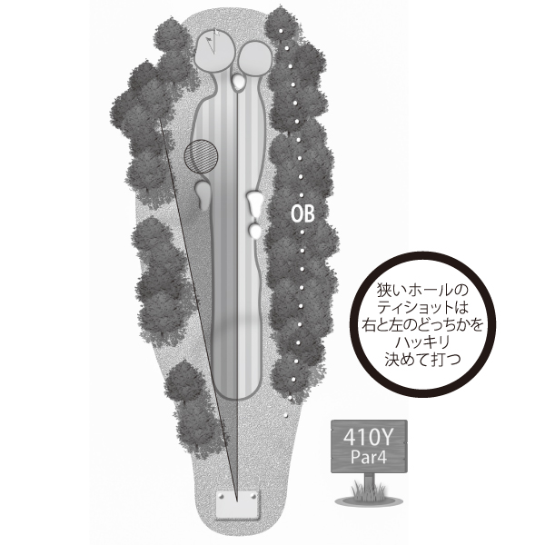 フェアウェイが狭くても長いホールならフェアウェイキープよりもフェアウェイを二等分して安全なサイドを選択し、2打目でグリーン方向を狙えればどこでもOKと割り切ろう。