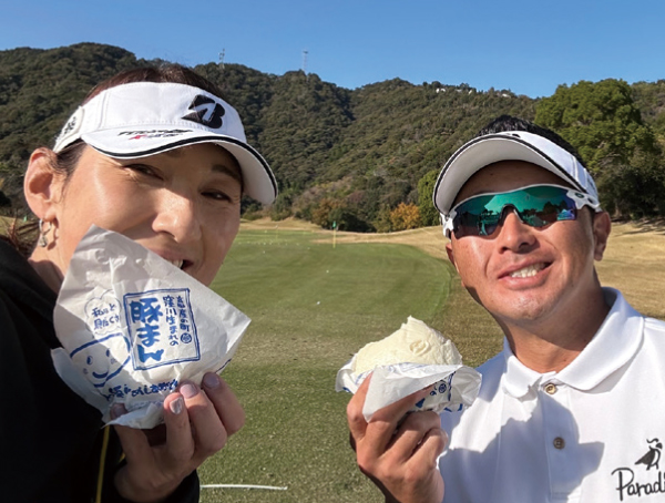 昨年のカシオワールド、お腹がすいて片岡大育プロと豚まんをパクパク(笑)。