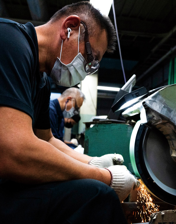 信栄 はい。次が研磨工程ですが、三浦では1人の研磨師が1つのヘッド全体を仕上げていくという工程はとっていません。すべて分担性です。最初は構えたときの顔の印象を決める輪郭研磨、そして次がフェース研磨。この2つは機械研磨です。そして次のトップライン、ホーゼルは職人がやり、最後に全体を確認しながら削る整形研磨で整えます。