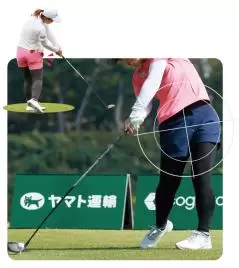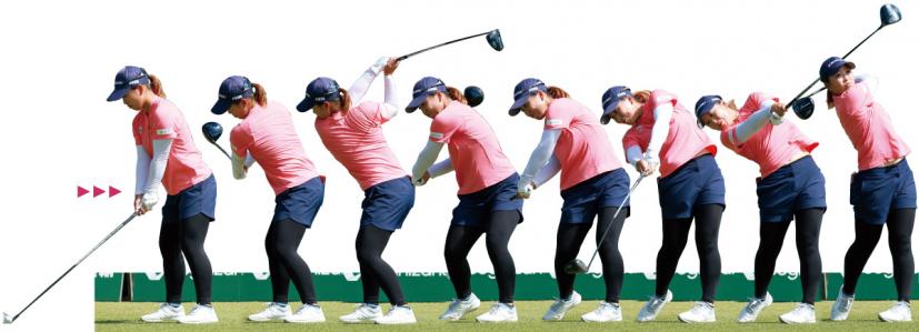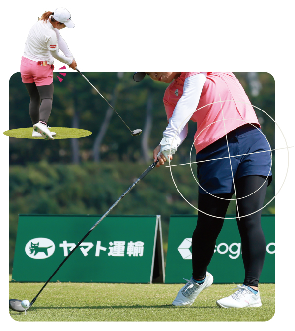 「低めの”出前持ち”トップから、右足を蹴りつつお尻を大きく動かすことで、体を一気に回転させています。上背がないため横振りスイングですが、アッパー軌道が一番飛ぶといわれる現代のクラブにはもっともマッチしたインパクトを実現。ただし、そのまま振り抜くと左に飛びやすいのでフォローは縦に振って高い位置に上げることで調整しているようです」(古閑)