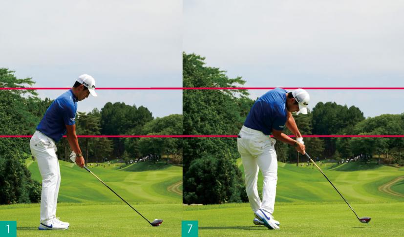 手元を高くしても、体が伸び上がってしまうのはNG。中島選手は足をジャンプするくらい蹴っていますが、頭の位置をアドレスよりも低くすることによって体全体が伸び上がらない姿勢でボールを打っています。頭を低くすることでアドレスからインパクトまで上半身の前傾角度をキープできます。それが再現性の高いスイングにつながっていると言えるでしょう。
