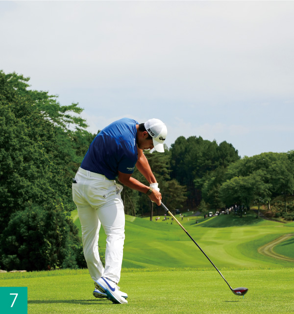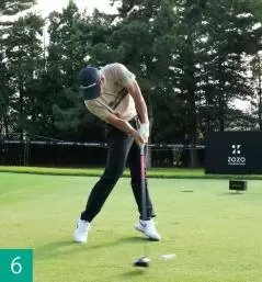 ダウンスイングでも下半身を先に踏み込んで上半身が下りてくるのでヘッドが加速しています(写真5)。インパクトからフォローにかけては左腰がしっかり回っているので、体を回転させるパワーによってヘッドスピードを上げることができる。効率良く体を使うことで、スリムな体型でも平均飛距離300ヤードを超えるドライバーショットが打てるのです。