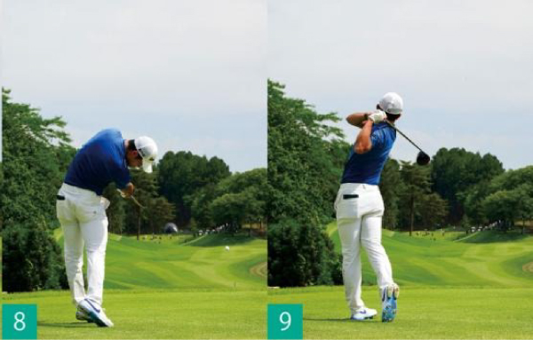アマチュアの皆さんに参考にしてほしいのは手元の高さと頭の高さです。アドレスとインパクトを比較すると、手元は10センチ以上も高くなっています(写真1と写真7)。