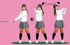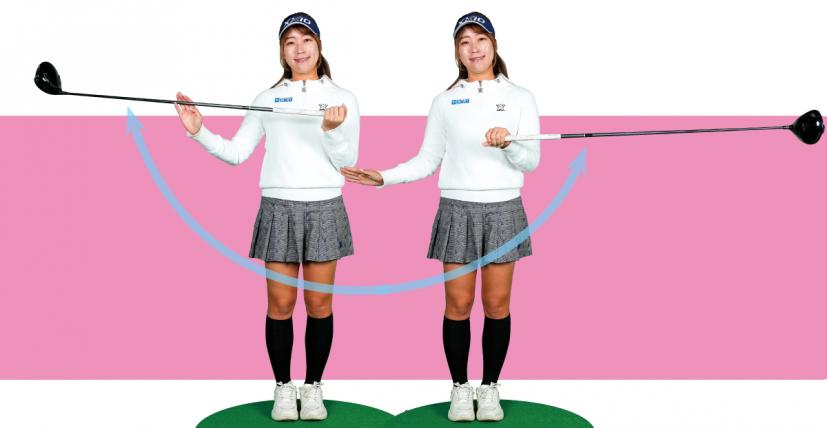 切り返しについて押尾は「バックスイングのスピードがゼロになった瞬間、右手でシャフトを押す感覚で一気に力を入れるとヘッドスピードが上がる」と語る。