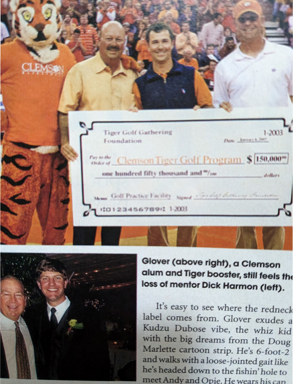 クレムソン大学タイガースのゴルフ部への15万ドルの寄付金贈呈式。マスコットのタイガーとともに。07年ゴルフワールド誌1月19日号(右端グラバー)。