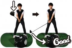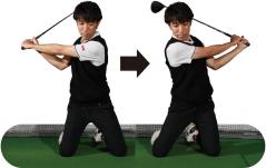 両ヒザを地面につけ、下半身を使わずに素振りをしてみましょう。体だけを先行して回転させてしまうと、クラブが地面を叩いいて素振りができないはず。体と腕とをシンクロさせて回転させ、腕をピュンと走らせる感覚を養いましょう!