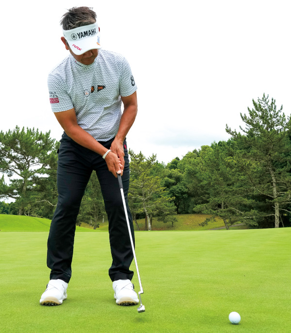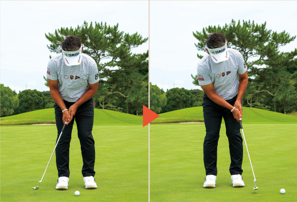 ジャストタッチで狙うのではなく、20~30センチオーバーが理想的。そして構える時に、そのボールのコロがりを頭にしっかり描きます(左写真)。