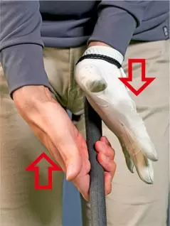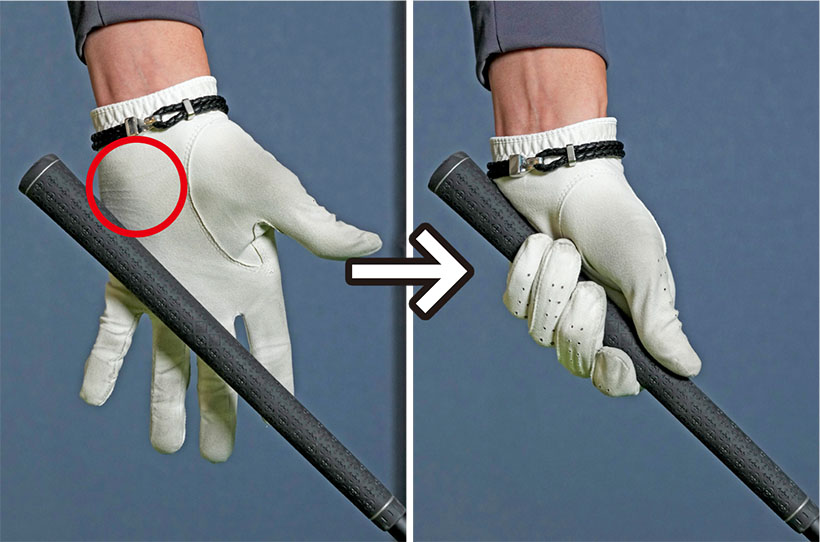 ゴルフクラブというのはグリップよりも先端のクラブヘッドが重いので、クラブを支えるように持つのはけっこう難しいものです。そのため左手の小指球で上から押さえるような感覚で持つのが理にかなっています。