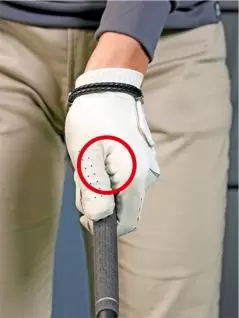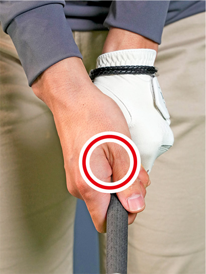 一方の左手は「小指球(しょうしきゅう)」という小指のツケ根の膨らみの部分をグリップの真上に乗せるのがポイントです。